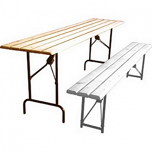 Стол складной.Столешница изготовлена из сосновых брусьев толщиной 30 мм. Поверхность столешницы покрыта прозрачной краской на основе масла и воска по технологии фирмы OSMO. Столы данной группы пригодны для использования на открытом воздухе.
