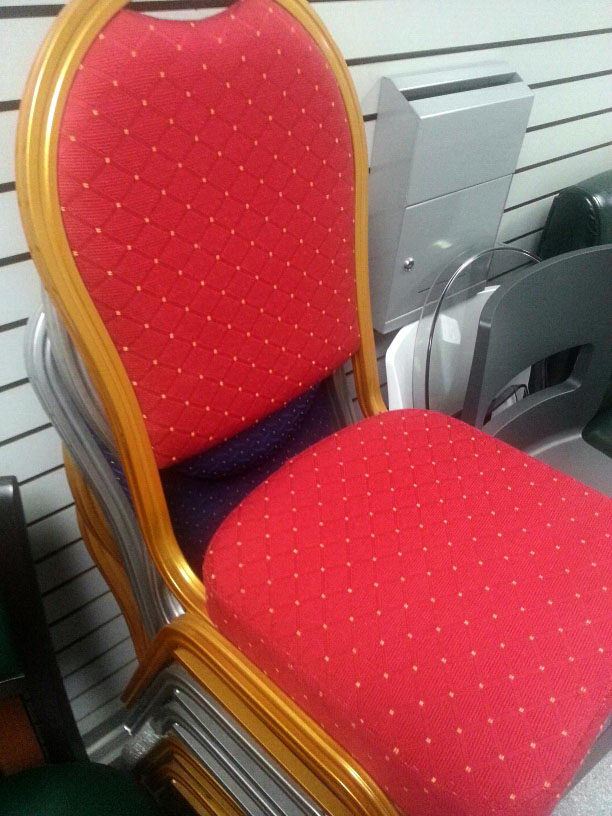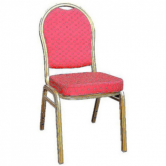 Алюминиевый (облегченный) каркас. Цвет каркаса — золото, ткань — красная. Профиль алюминиевой турбы 20х20 мм. Спинки и сиденья - пенополиуритан.