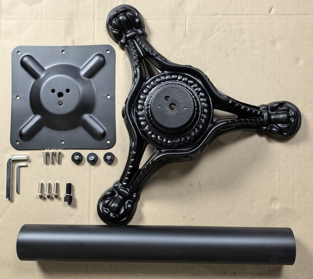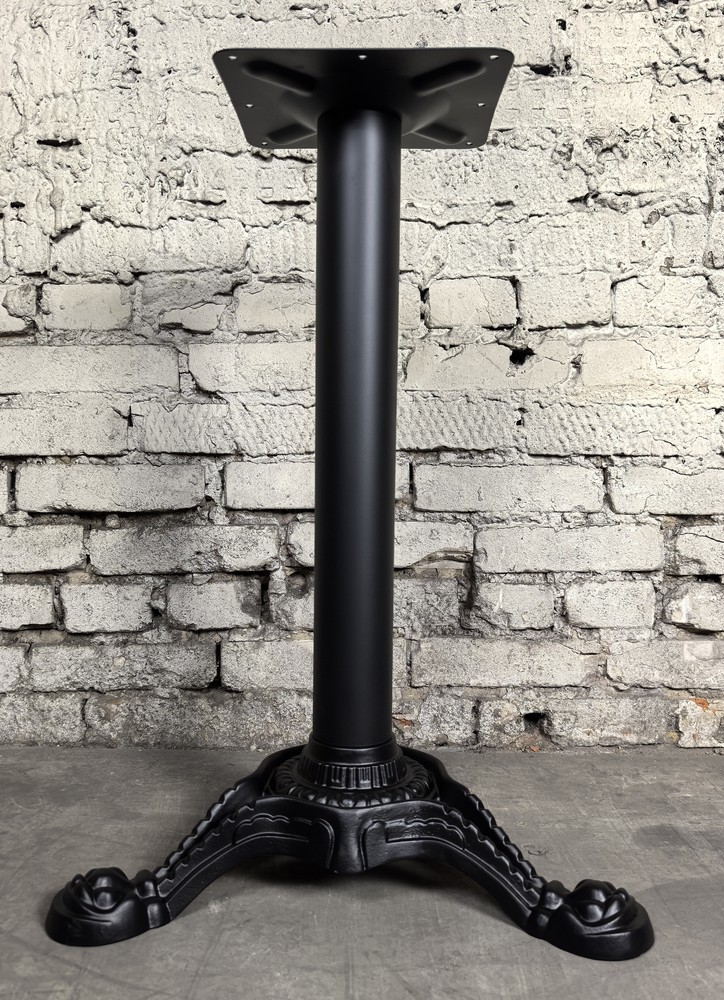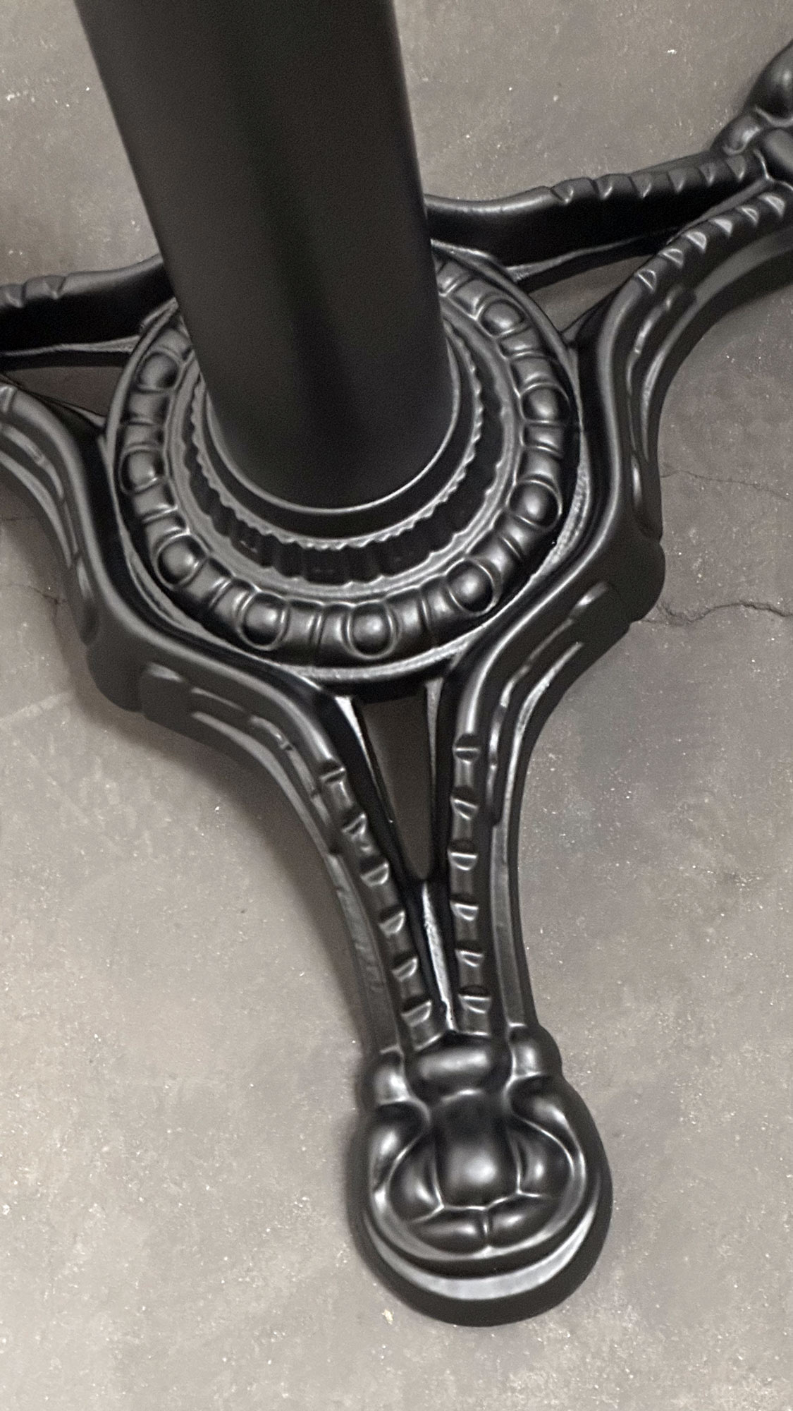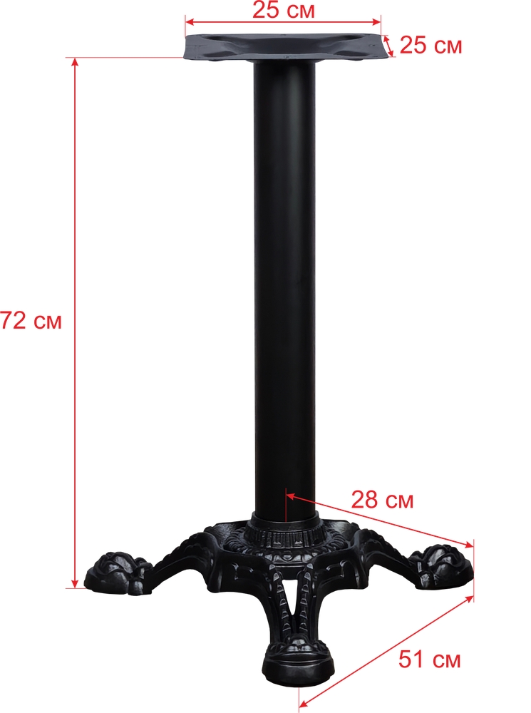 Подстолье чугунное. Труба - стальная. Основание - чугунное литье. Диаметр основания: 58 см, диаметр трубы: 7,6 см, размер верхней площадки: 25х25 см. Рекоменд. макс. размер столешницы - D-70.