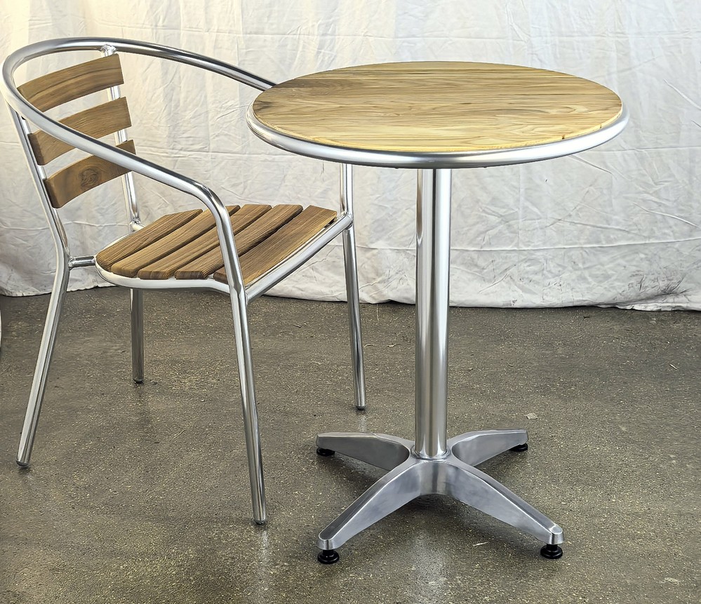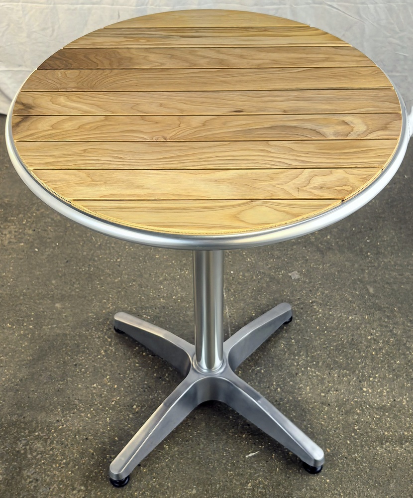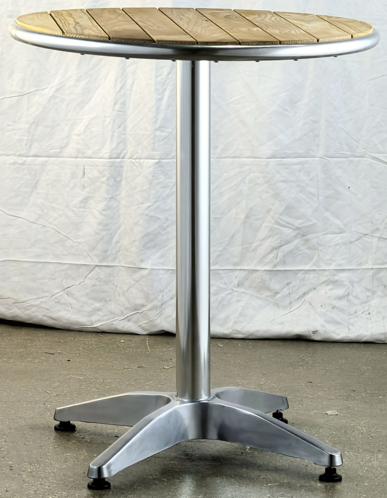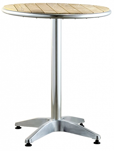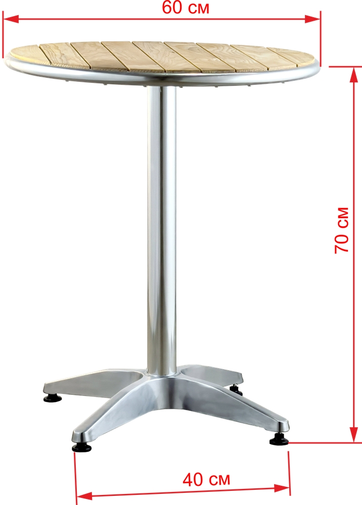 Стол алюминиевый. Каркас - алюминий. Столешница: деревянные перекладины. Верхний крест: 300х300мм сплав чугуна. Труба: Ø58, толщина стенки 1.1мм. Основание крестовое: 580х580мм из алюминия.