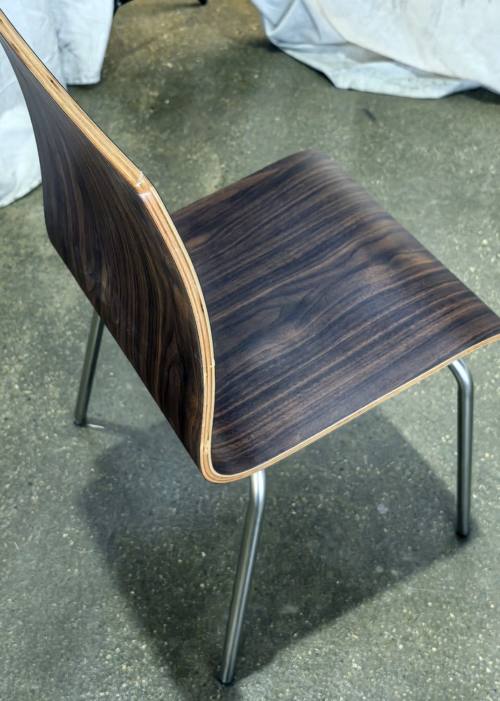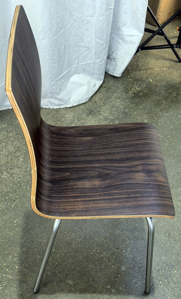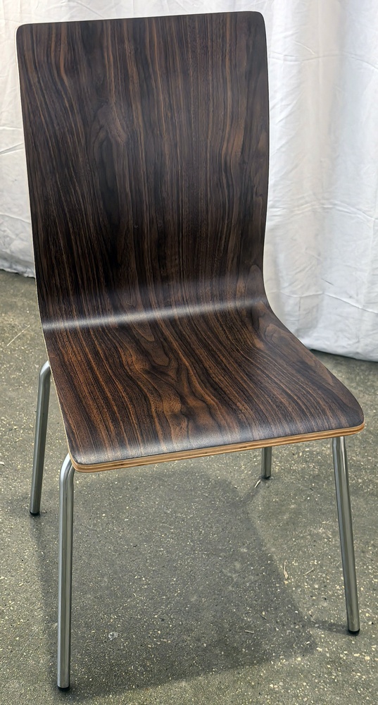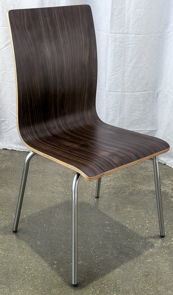 Стул металлический. Каркас - нержавеющая сталь полированная до зеркального вида. Спинка и сиденье - жесткое. Сиденье - ламинированная фанера. Цвет: темный орех.
