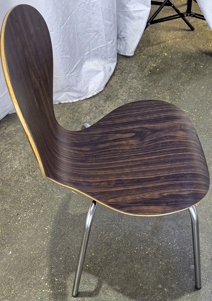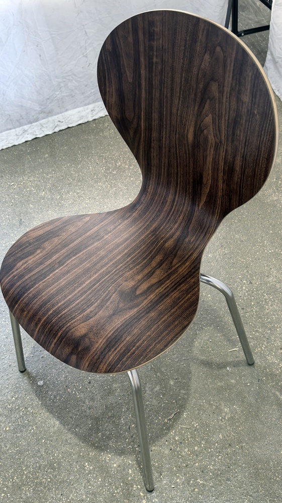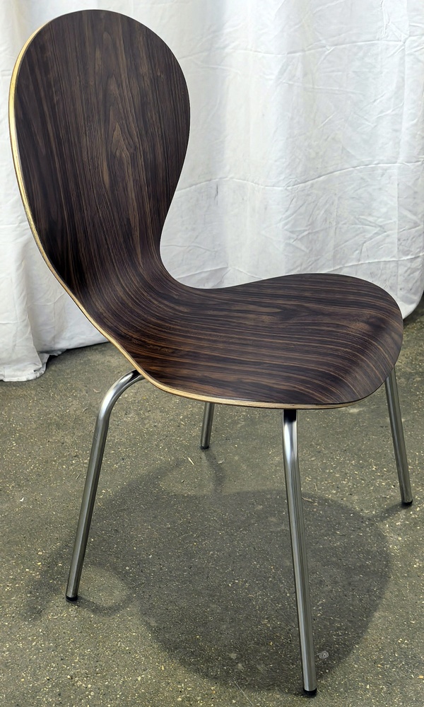 Стул металлический. Каркас - нержавеющая сталь полированная до зеркального вида. Спинка и сиденье - жесткое. Сиденье - ламинированная фанера. Цвет: темный орех.