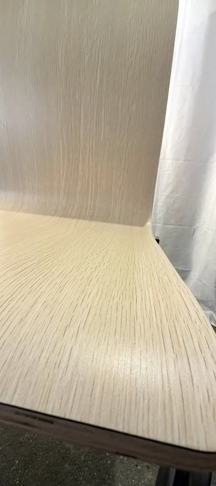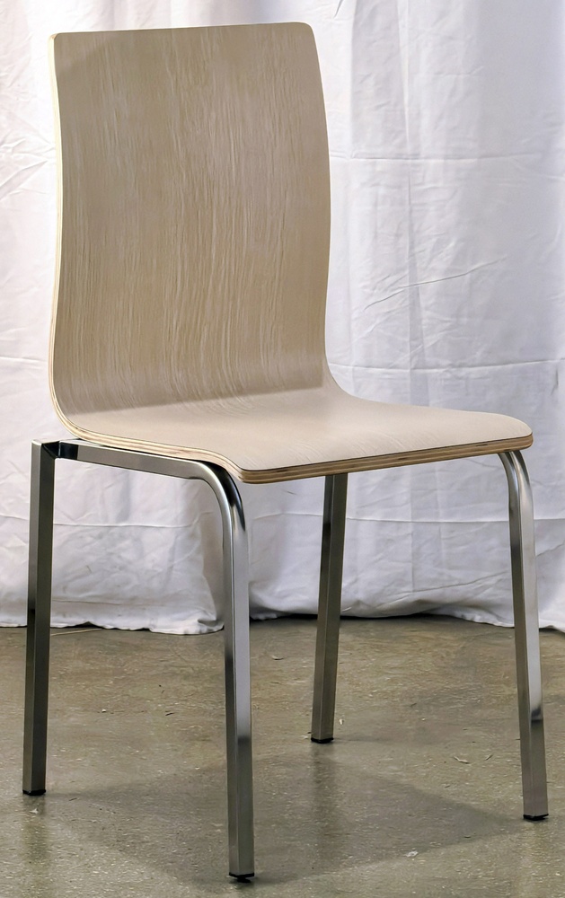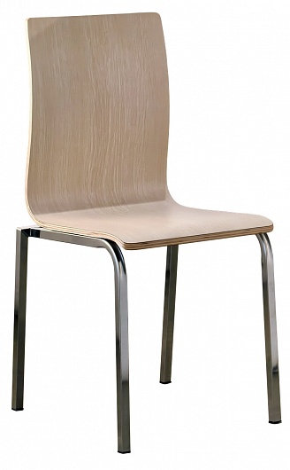 Стул металлический. Каркас - полированная нержавеющая сталь, спинка и сиденье - жесткое. Сиденье - ламинированная фанера. Цвет: бук.